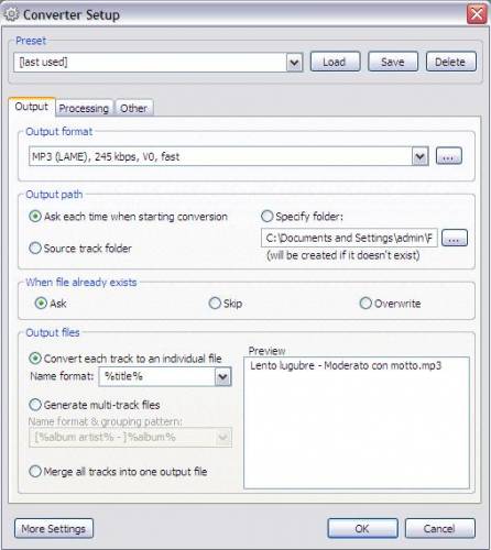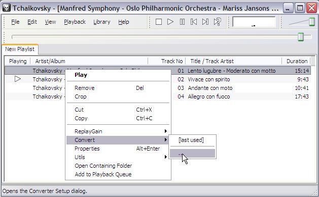 | Существует много таких программ, но в основном они платные. Есть также хорошие бесплатные программы, вроде MediaCoder. Кроме того, некоторые плеера поддерживают конвертацию, например AIMP2 и foobar2000. Меня полностью устраивает последний, поэтому расскажу как им конвертировать аудиофайлы. Допустим, нам надо произвести конвертацию APE-файла (или файлов) в формат MP3. Добавляем его в плейлист, нажимаем по нему правой кнопкой мыши, и выбираем в меню пункт 'Convert' и затем '...', как показано на скриншоте. После этого в появившемся окне настройки конвертации выбираем из списка под 'Output format' нужный формат (см. скриншот). В данном случае лучше всего для MP3 выбрать VBR лучшего качества. Для этого предварительно нажимаем на кнопку справа от списка '...' и, выбрав MP3(LAME), передвигаем ползунок до конца вправо. В результате будет сформирована требуемая команда. После этого в разделе 'Output path' указываем путь к папке, в которой будут храниться полученные файлы или же не указываем (1-й пункт). Затем внизу в области 'Output files' отмечаем пункт "Convert each track to an individual file" (или же 3-й пункт для получения получить один объединенный MP3-файл). Аналогичным образом можно конвертировать аудиофайлы других форматов (flac, wav и т.д.). Для конвертирования в MP3 необходимо иметь кодек LAME (файл lame.exe). Его можно скачать на следующей странице: http://www.free-codecs.com/download/Lame_Encoder.htm