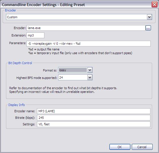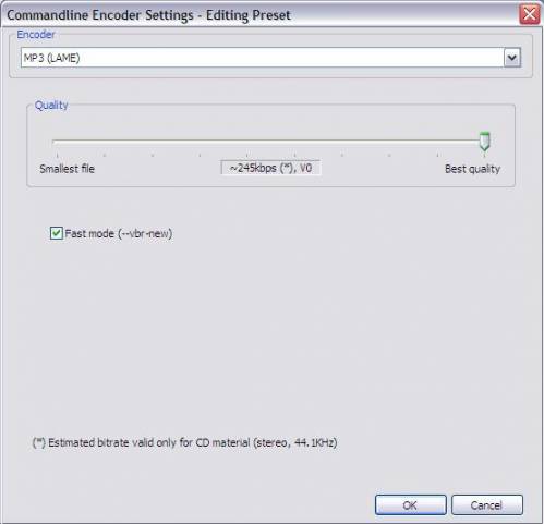 | 320 kbps - это CBR. Из списка 'Encoder' (см. 3-й скриншот наверху) надо выбрать 'Custom' и задать нужные параметры. Про последние можно прочитать здесь: http://lame.cvs.sourceforge.net/*checkout*/lame/lame/USAGE